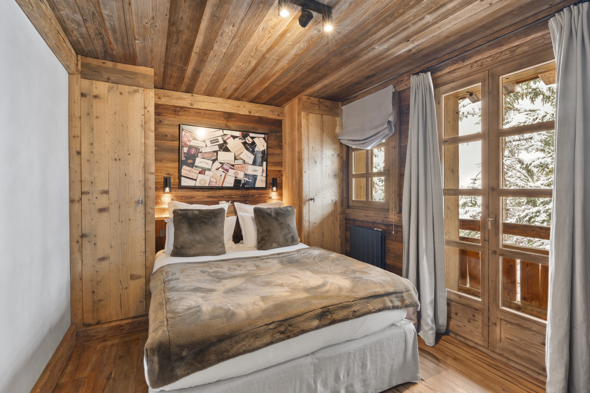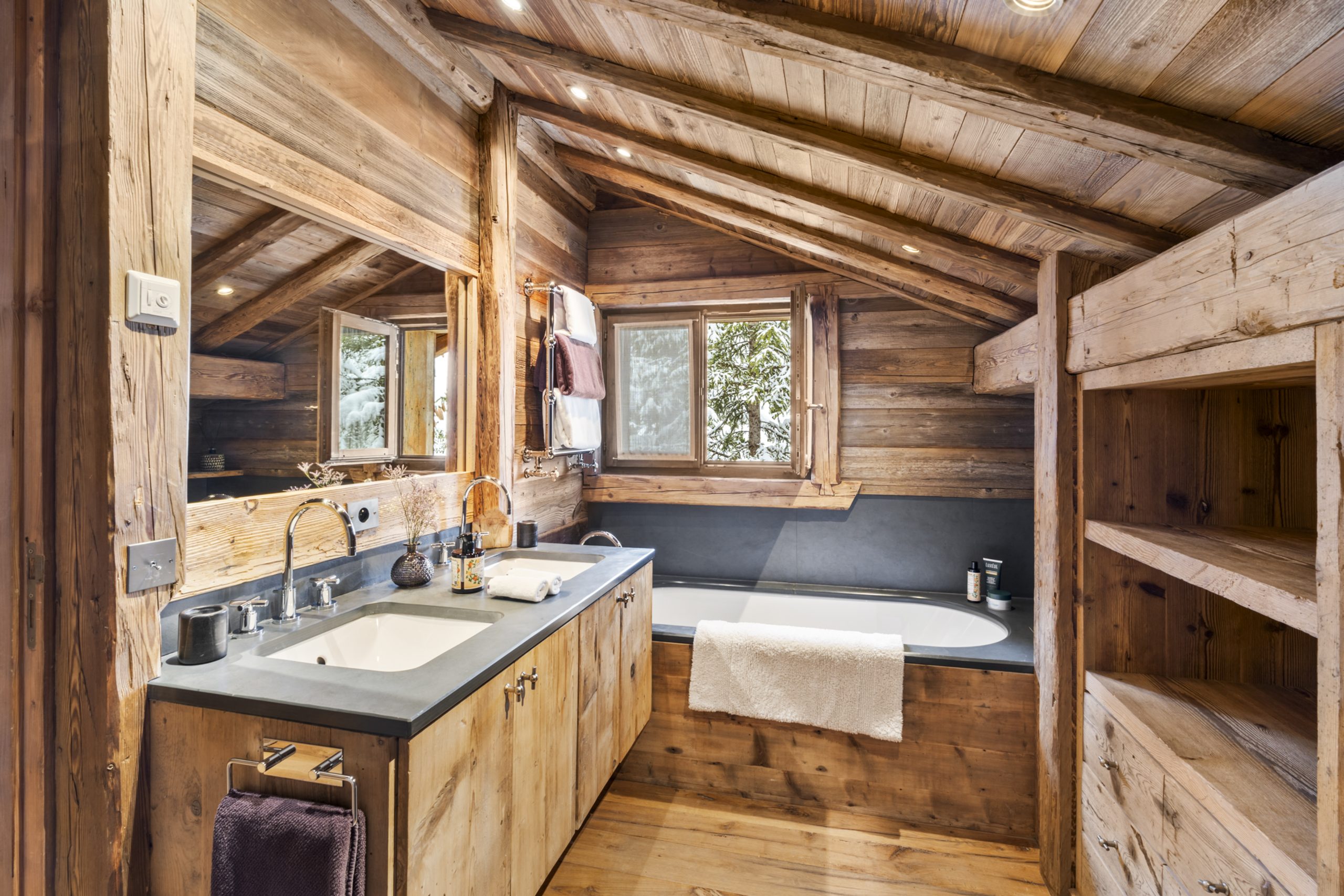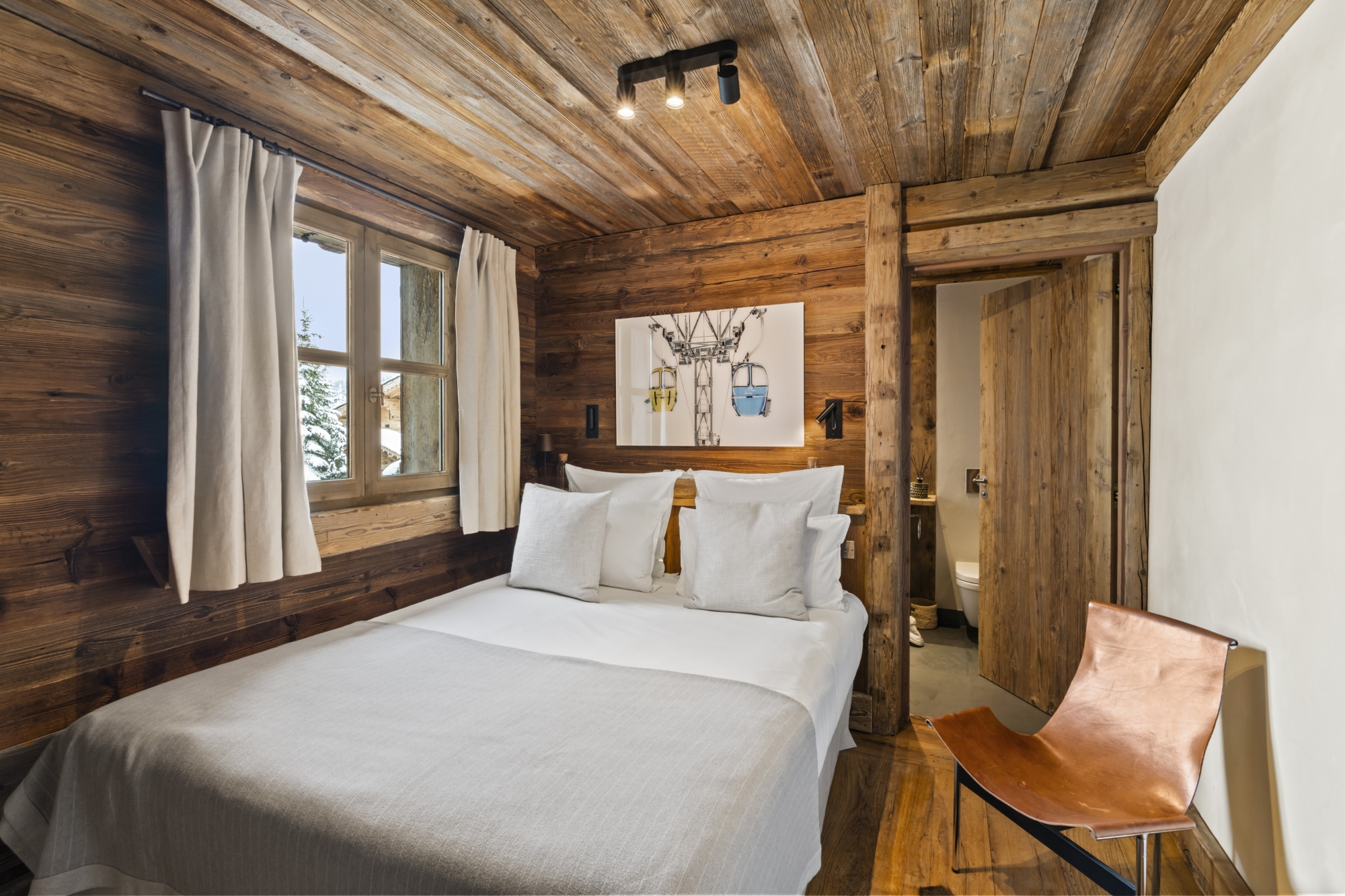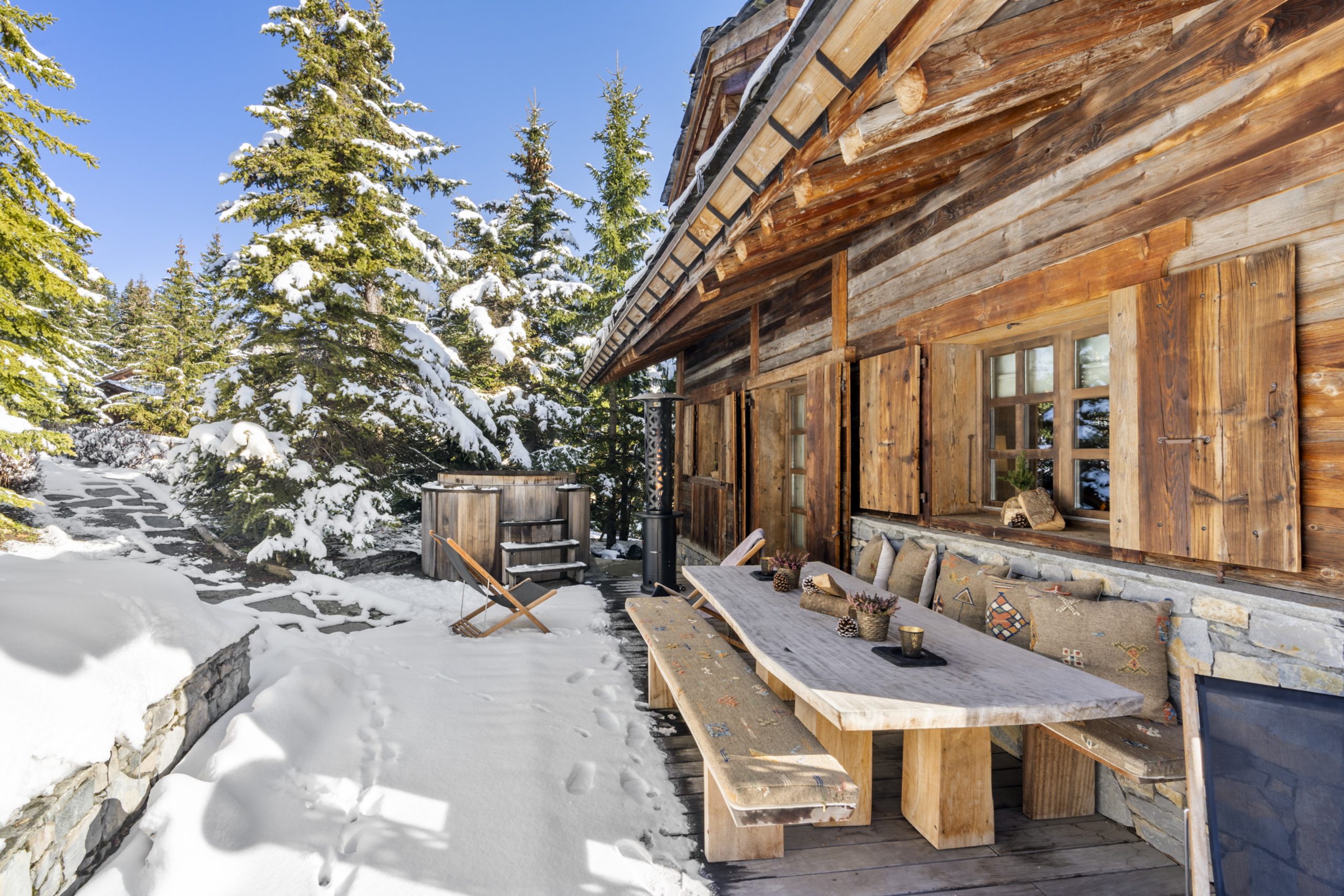 Chalet Horizon embodies the perfect balance between tradition and modern elegance. Antique woodwork, century-old beams and glass tiles create a warm atmosphere typical of mountain refuges, while incorporating the refinement of Courchevel chalets. The common areas, notably the vast living room with its cathedral ceiling, are wrapped in weathered wood, offering a welcoming and authentic setting. The chalet’s seven bedrooms – five doubles, and two for children – are true cocoons, inspired by the tranquility of the surrounding mountains. Each level of the chalet features balconies or terraces, so you can enjoy the natural surroundings at any time of day.